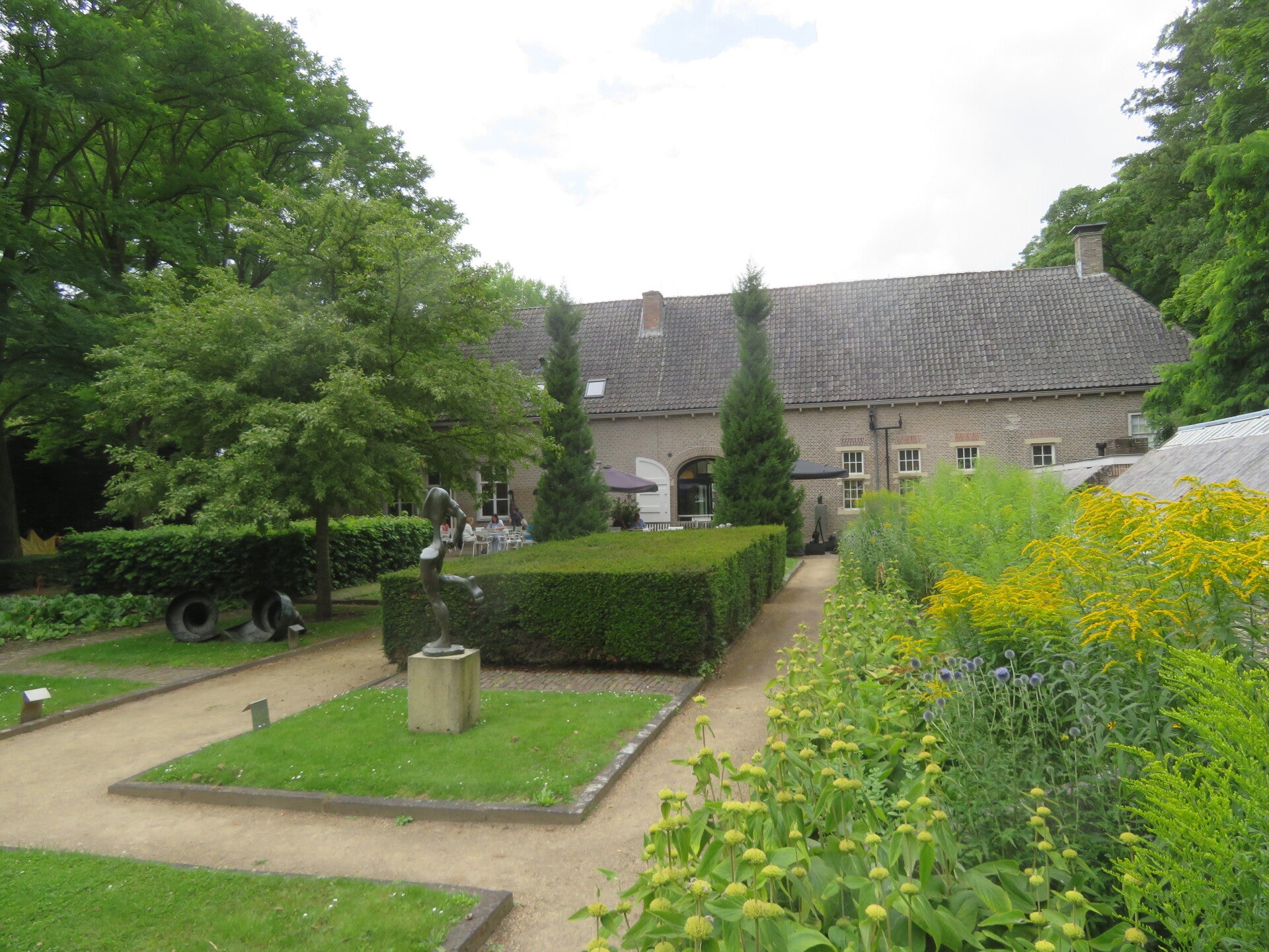Het kasteel ligt er mooi bij in een fraai landschap als we er vanaf de parkeerplaats naar toe wandelen. Het kasteel zelf is gerenoveerd in de twintigste eeuw op kosten van de provincie maar heeft wel een rijk verleden met onder andere als bewoners de niet onbekende families Bentinck en van Pallandt. De restauratie is kennelijk vooral aangejaagd door Dirk Hattema die er uiteindelijk ook is gaan wonen en waarvan de verzameling privékunst de basis voor de collectie van de fundatie is geweest. We betalen € 17,= per persoon en lopen eerst het kasteel in waar vooral voorwerpen en veel schilderijen uit het bezit van Hattema zijn ten toon gesteld. Helaas hangen er bij de kunstwerken geen verwijzingen wie de maker is geweest en moeten we dat steeds per ruimte opzoeken in een tamelijk onhandig soort krant waar we niet erg gelukkig van worden en wat afleidt. Naast wat serieus oud spul inclusief wat kerkelijke ornamenten toch vooral schilderwerk van “modernisten” van begin twintigste eeuw. Stukken van vader en dochter Toorop, Jan Sluijters, Picasso en Ensor als bekendste namen. Veel werken van Paul Citroen en Jan Voerman die naast veel vee, waar we hem wel van kennen, ook prachtige landschappen blijkt te hebben gemaakt. Hoogtepunt uit die periode is voor mij een beschilderd klavecimbel van Piet Moesman onze stadsgenoot. Uit een wat latere periode nog een leuke Oepst en mooi glaswerk van een Spaanse dame met de naam Dora Dolz waar we later in de tuin ook nog kleurrijke beelden van tegen komen. Hattema had kennelijk ook het idee dat een Duitse kunstenaar Ernst Grosse en de Italiaan Gino Severini wel wat konden want van beiden hangt er veel, maar ons zeggen de namen niks en de meeste stukken van de heren zijn nou ook niet heel interessant.