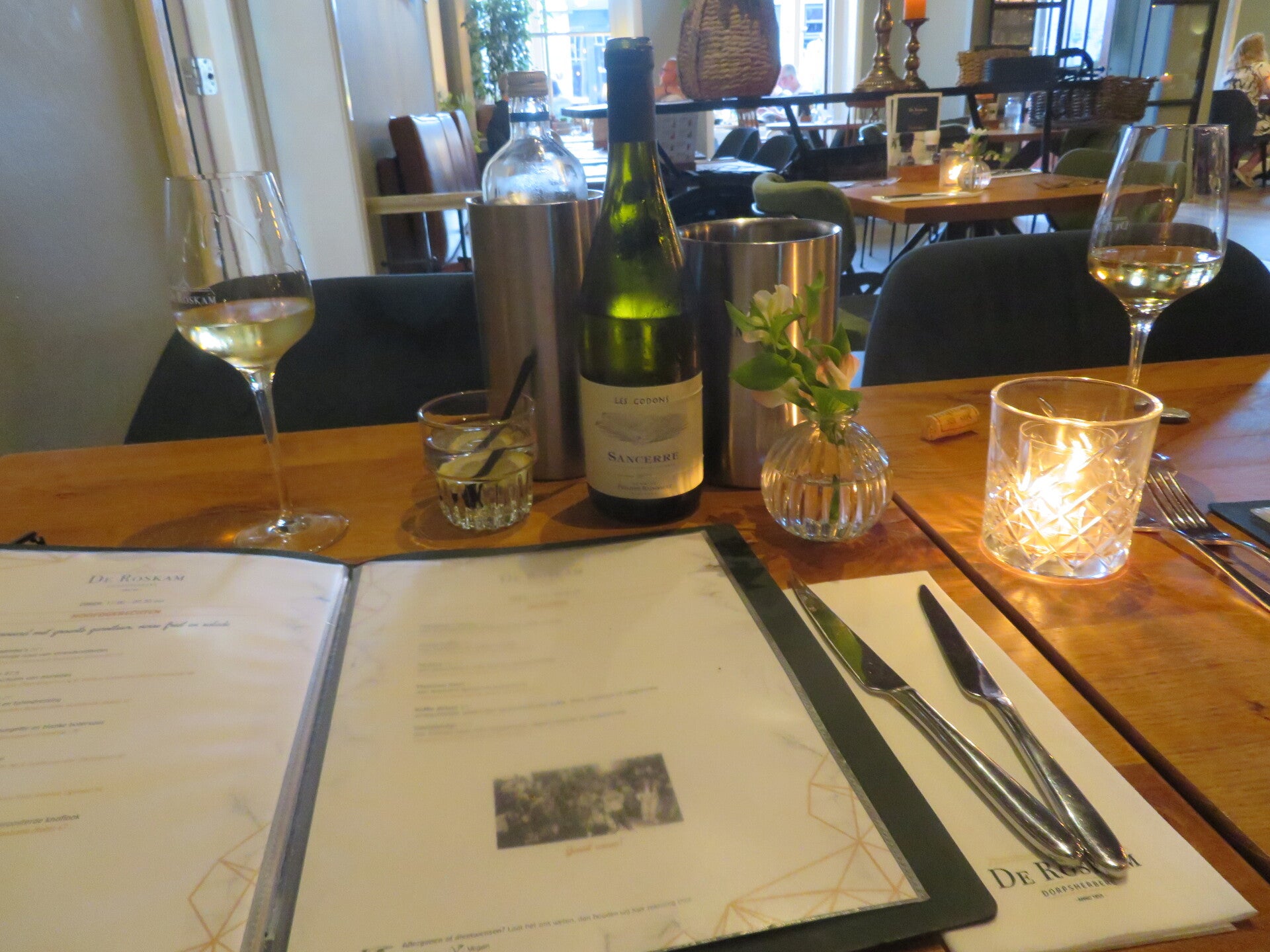 Om half zeven stappen we naar buiten richting “Dorpsherberg de Roskam”. Daar zit het buiten helemaal vol maar binnen kunnen we er nog makkelijk bij. Later begint het toch weer te regenen en vluchten mensen alsnog naar binnen die eerst per se buiten wilden zitten. Van binnen een mooie zaak en zoals al eerder aangegeven is de buitenkant ook fraai. De wijn wordt de beste van de vakantie, een zachte niet zo scherpe Sancerre van Raimbault die ook nog betaalbaar is. Ik zie geen voorgerecht waar ik nou heel enthousiast van wordt zodat we allebei voor een hoofdgerecht gaan. Eega neemt een kippen dij met satesaus die eerst het predikaat lekker krijgt maar later toch als wat minder wordt beoordeeld omdat er nog her en der een velletje om het dijtje zit. Voor mij wordt het kabeljauw met olijven, gezuurde komkommer, aardappel mousseline, spinazie en een beurre blanc die buitengewoon lekker is met als enige minpuntje dat het snel afkoelt. Erbij nog wat frites en salade die voor voldoende vulling zorgen. Desserts worden een Pavlova voor mij die ik totaal niet als Pavlova herken omdat de room ontbreekt en ik alleen merengue zit te knagen. Voor de dame een cafe de luxe die bestaat uit cappuccino met wat koekjes en chocolaatjes. Ook dit is natuurlijk niet helemaal wat we verwacht hadden, onze Franse vrienden snappen het toch wat beter met hun cafe gourmand. Na een kleine twee uur € 130,= afgerekend en achteraf een wat vreemde ervaring, we hebben hele fijne en hele matige dingen mogen nuttigen maar het zat er in ieder geval lekker.